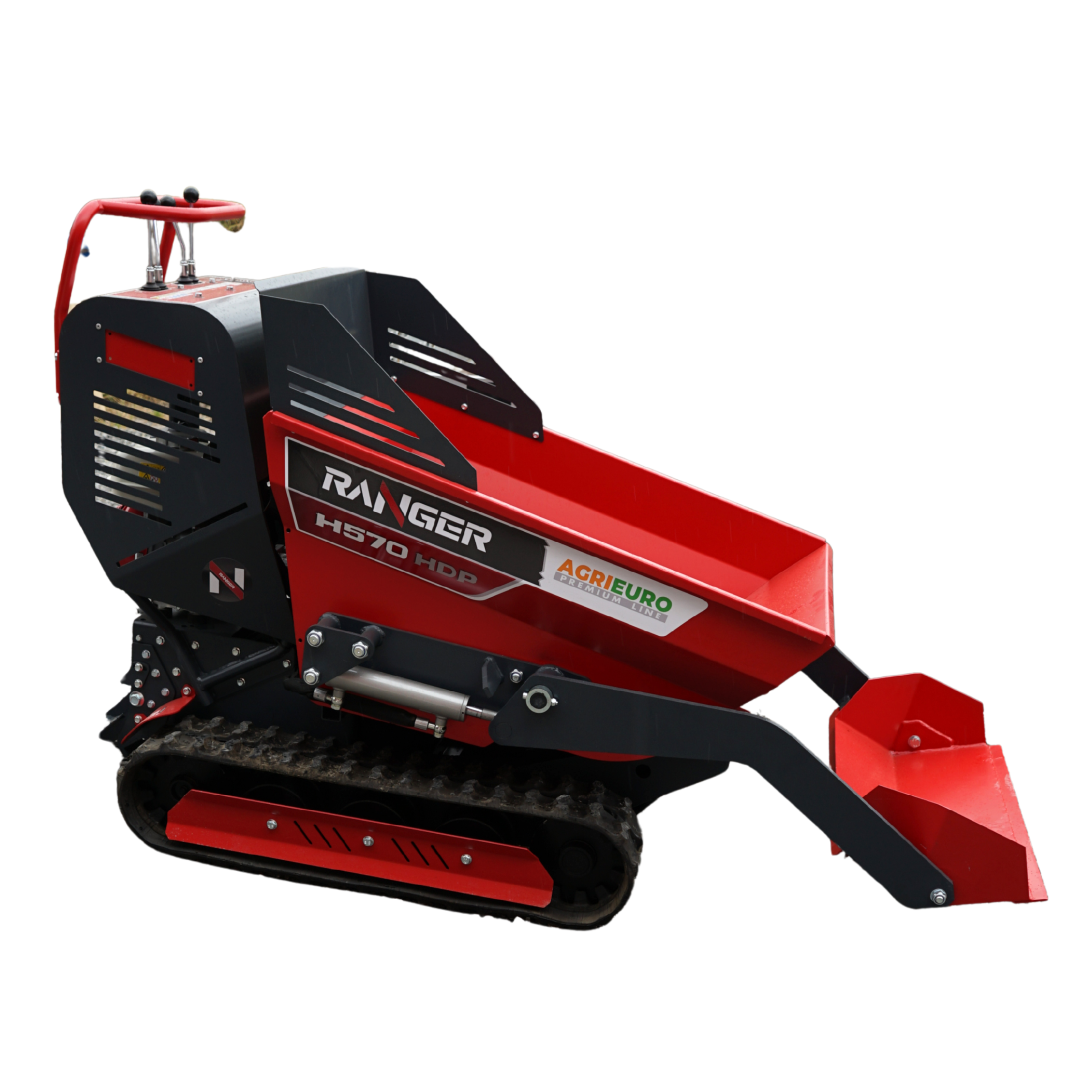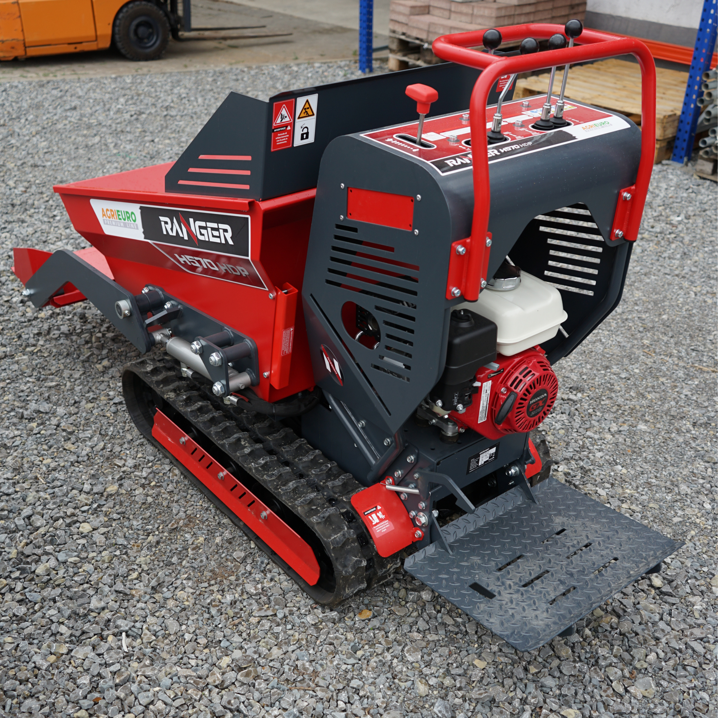 Der Raupendumper Ranger H570 HDP mit Honda GX200 Motor ist perfekt geeignet für schwere Transporte auch auf unebenem Gelände. Dank seines Raupenantriebs, der hydraulischen Dumper-Mulde und der Hydrostatik-Getriebeart bewältigt er mühelos Lasten und herausfordernde Arbeitsbedingungen. Der stabile Stahlrahmen, die großzügige Plattform und die intuitive Bedienung machen ihn besonders effizient.